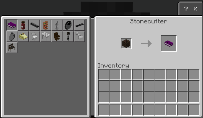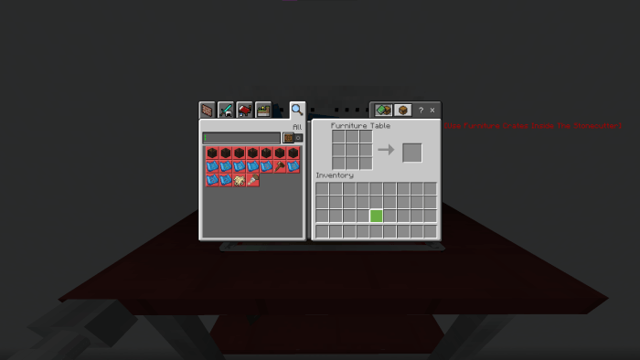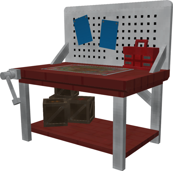 Une fois les plans utilisés sur l'établi, un bloc spécial (une caisse) sera ajouté à l'inventaire, que l'on pourra ensuite scier sur la scie à pierre. Un seul bloc (une seule caisse) permet d'obtenir différents objets : tables, chaises, horloges ou jouets, tout dépend de la recette choisie.