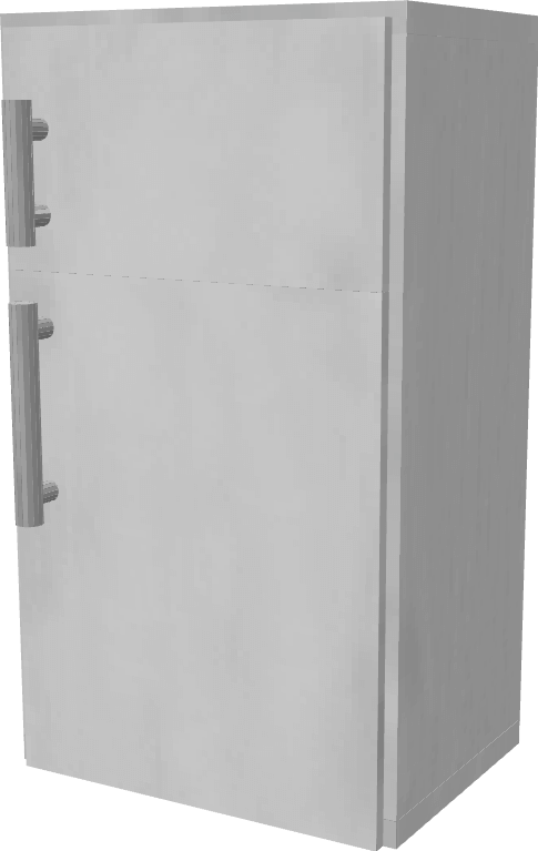 Réfrigérateur à deux portes avec compartiment congélateur et compartiment standard, disponible en gris. L'appareil s'intègre parfaitement à la pièce et est facile d'accès : les portes s'ouvrent pour dévoiler son contenu.